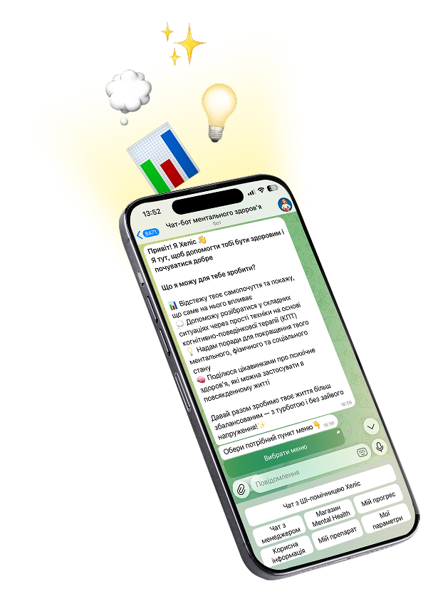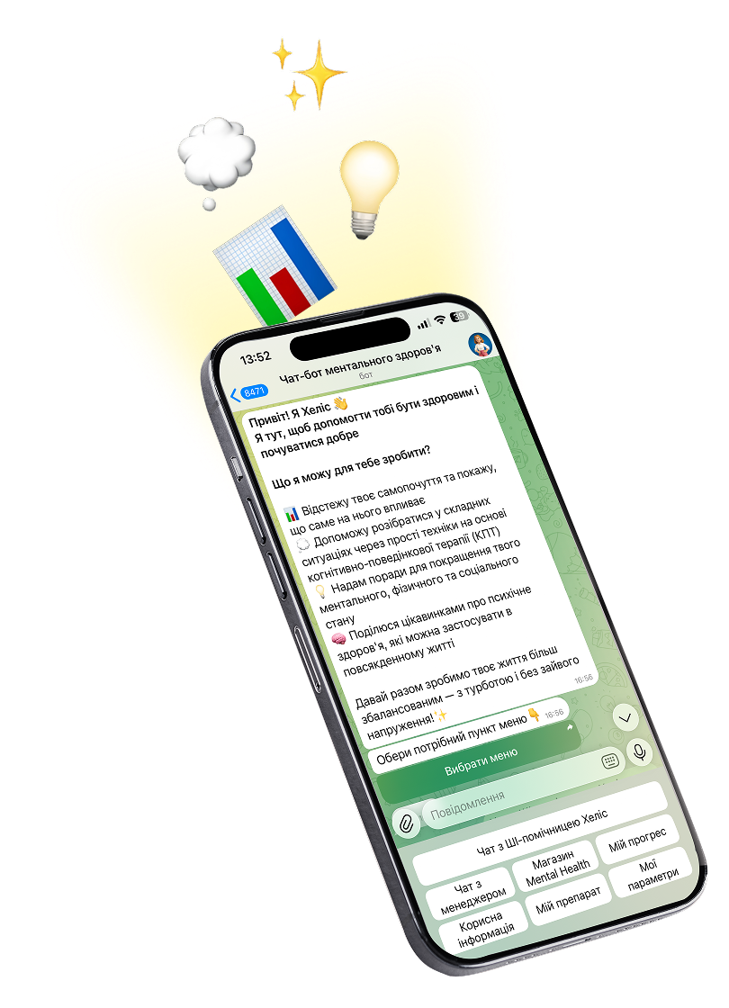 Протягом дня чат-бот поруч і підказує, що може допомогти, коли з’являється напруга чи тривога або хочеться розібратися з думками. Короткі практики в моменті та інструменти КПТ.